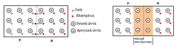 Την στιγμή που τα δυο υλικά «ενώνονται» τα ηλεκτρόνια και οι οπές που βρίσκονται στην περιοχή γύρω από την επαφή θα συγκεντρωθούν και θα επανασυνδεθούν με αποτέλεσμα να δημιουργηθεί έλλειψη ελεύθερων φορτίων κοντά στην επαφή.