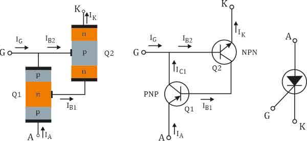 Η ερμηνεία της λειτουργίας του SCR βασίζεται στη συμπεριφορά της διόδου Ρ-Ν-Ρ-Ν. Όπως προαναφέρθηκε, το SCR είναι μια διάταξη τεσσσρων στρωμάτων, όπως η δίοδος διόδου Ρ-Ν-Ρ-Ν, στην οποία έχει προστεθεί μια επαφή στο ενδιάμεσο Ρ-τύπου στρώμα. Το ισοδύναμο κύκλωμα παρουσιάζεται στα ακόλουθα σχήματα.