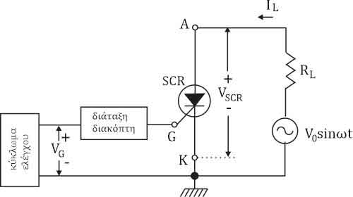 Στο σχήμα παρουσιάζεται το κύκλωμα ελέγχου ισχύος με ένα SCR. Το κύκλωμα αποτελείται από το SCR, την αντίσταση φορτίου RL, το κύκλωμα ελέγχου και τη διάταξη διακόπτη, η οποία μπορεί να είναι μια δίοδος Ρ-Ν-Ρ-Ν ή μια δίοδος DIAC. Το κύκλωμα ελέγχου τροφοδοτεί με παλμούς, οι οποίοι μεταφέρονται στην πύλη του SCR όταν υπερβούν την τάση διάσπασης της διόδου Ρ-Ν-Ρ-Ν ή της διόδου DIAC. Όταν μεταφερθεί ένας παλμός στην πύλη και το SCR μεταβεί στην κατάσταση ΟΝ, τότε η τάση στα άκρα του SCR θα μηδενιστεί και θα διέρχεται ρεύμα IL μέσα από την RL.