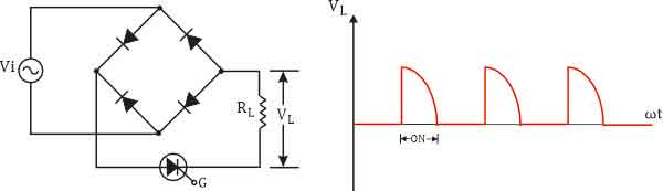 Στο σχήμα χρησιμοποιείται μια γέφυρα ανόρθωσης με “φόρτο” το σύστημα: SCR, αντίσταση φόρτου και κύκλωμα ελέγχου. Με αυτό το κύκλωμα στο SCR εφαρμόζεται η πλήρως ανορθωμένη τάση, η οποία σύμφωνα με το σχήμα έχει μόνο θετικές τιμές. Αυτό δίνει στο κύκλωμα τη δυνατότητα να λειτουργεί στο 100% της περιόδου.