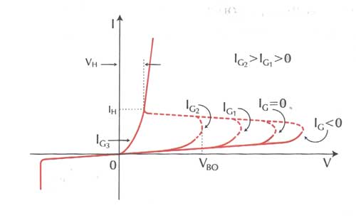 Βασικό χαρακτηριστικό της διάταξης είναι ότι όταν το ρεύμα της πύλης είναι μηδέν τότε το SCR συμπεριφέρεται ως δίοδος Ρ-Ν-Ρ-Ν. Όταν διαβιβαστεί ένα θετικό ρεύμα μέσα από την πύλη τότε η τάση σκανδαλισμού ελαττώνεται και η ελάττωση είναι τόσο μεγαλύτερη όσο μεγαλύτερο είναι το ρεύμα. Για μεγάλες τιμές του ρεύματος πύλης (ΙG3 στο σχήμα) η τάση σκανδαλισμού είναι τόσο μικρή ώστε το SCR να παρουσιάζει μια χαρακτριστική ρεύματος-τάσης όμοια με αυτή των διόδων. Αντίθετα, για αρνητικές τιμές του ρεύματος πύλης η τάση σκανδαλισμού αυξάνει. Σε ένα SCR η τάση συγκράτησης και το ρεύμα συγκράτησης δεν εξαρτώνται από το ρεύμα πύλης.
