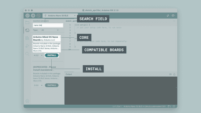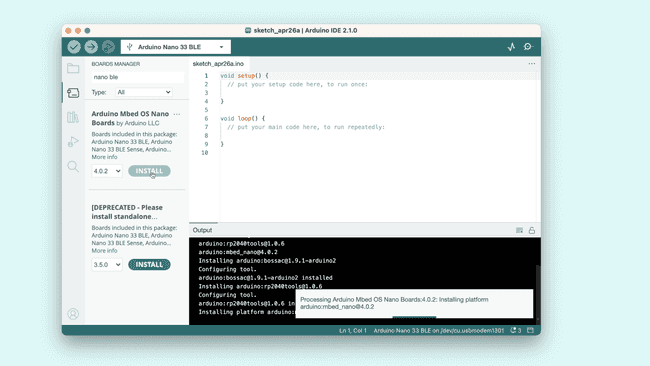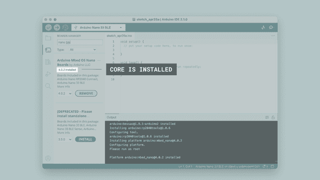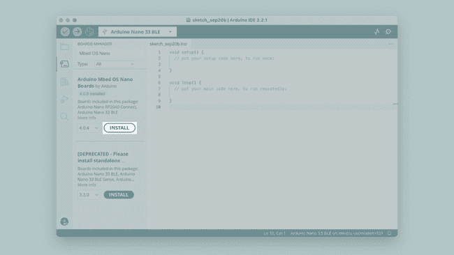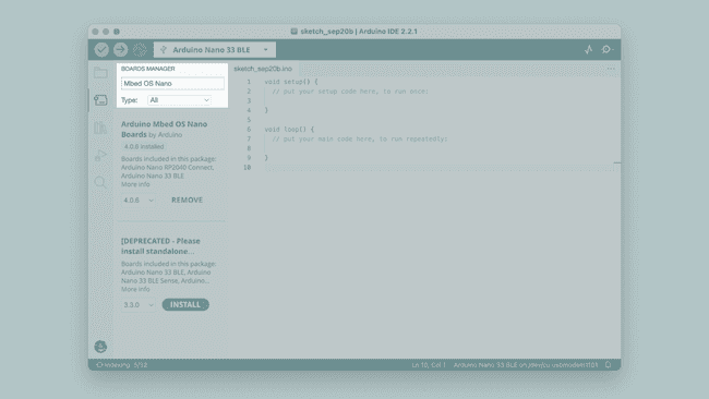 3] Θα εμφανιστεί τώρα μια λίστα με όλα τα διαθέσιμα πακέτα. Ας πούμε ότι χρησιμοποιείς μια πλακέτα Nano 33 BLE και θέλεις να εγκαταστήσεις το αντίστοιχο board package. Πληκτρολόγησε απλώς το όνομα στο πεδίο αναζήτησης και το σωστό πακέτο (Mbed OS Nano) θα εμφανιστεί, με την πλακέτα Nano 33 BLE να αναφέρεται στην περιγραφή. Κάνε κλικ στο κουμπί «INSTALL».