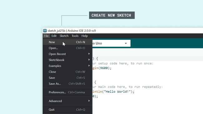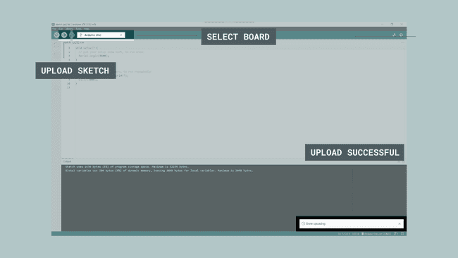 2] Δημιουργούμε ένα sketch με τις απαραίτητες ρυθμίσεις ώστε η πλακέτα μας να μπορεί να επικοινωνεί με τον υπολογιστή. Κυρίως πρέπει να ορίσουμε έναν ρυθμό baud, γράφοντας: Serial.begin(9600); Το 9600 αντιπροσωπεύει την ταχύτητα baud, δηλαδή τα μέγιστα bits ανά δευτερόλεπτο που μπορούν να μεταδοθούν. Το πλήρες sketch είναι το εξής: