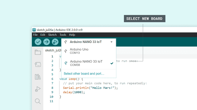 4] Μεταφορτώνουμε τον κώδικα και ανοίγουμε τον Serial Monitor. Θα βλέπουμε τώρα το “Hello Mars!” να εμφανίζεται κάθε δευτερόλεπτο. Αν τοποθετήσουμε τα δύο παράθυρα του sketch δίπλα-δίπλα, μπορούμε να παρατηρήσουμε πως εκτυπώνουν ταυτόχρονα.