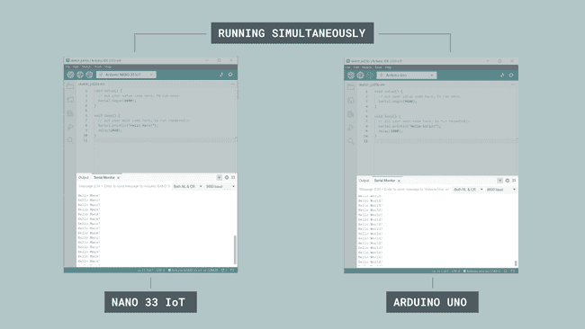 Πλεονεκτήματα Ένα σημαντικό πλεονέκτημα του ενσωματωμένου Serial Monitor είναι η δυνατότητα να έχουμε πολλά παράθυρα με το Serial Monitor ανοικτά ταυτόχρονα. Στην παλιά έκδοση, όταν αλλάζαμε θύρα/πλακέτα, η αλλαγή εφαρμοζόταν σε όλα τα παράθυρα. Επιπλέον, είχαμε περιορισμό σε ένα μόνο παράθυρο Serial Monitor. Αυτός ο περιορισμός αφαιρείται στο IDE 2.